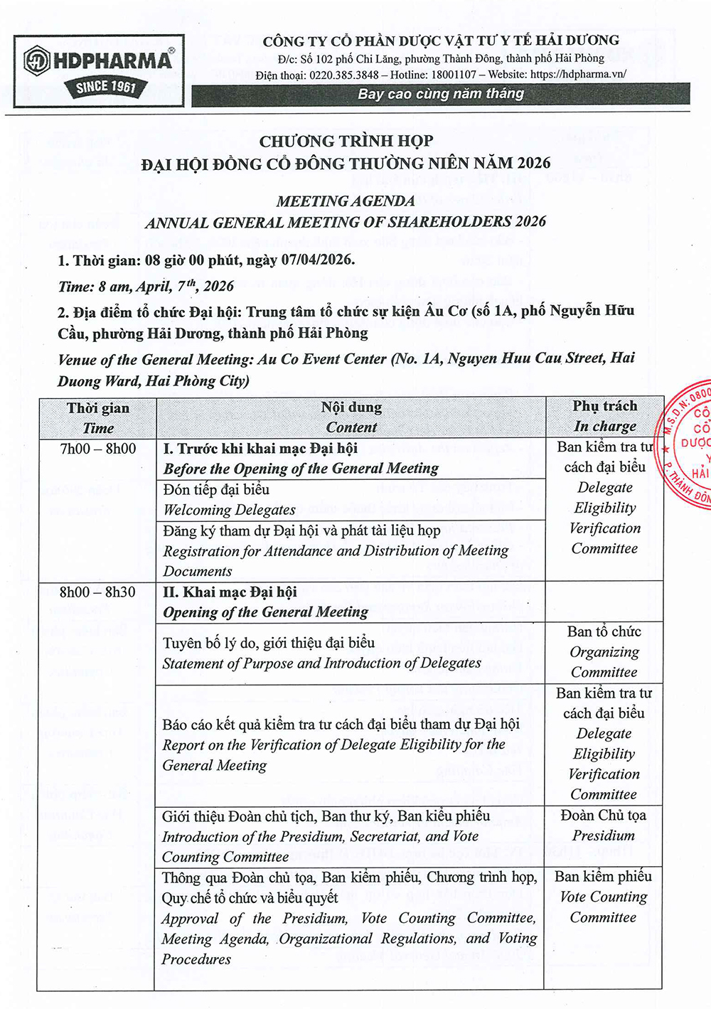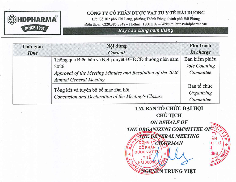 Công ty Cổ phần Dược Vật tư y tế Hải Dương (mã chứng khoán: DHD) công bố Chương trình họp Đại hội đồng cổ đông thường niên năm 2026.