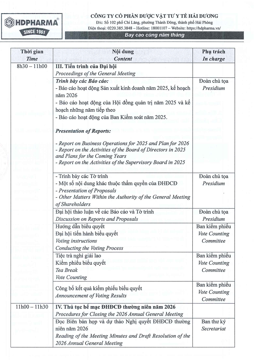 CHƯƠNG TRÌNH HỌP ĐẠI HỘI ĐỒNG CỔ ĐÔNG THƯỜNG NIÊN 2026