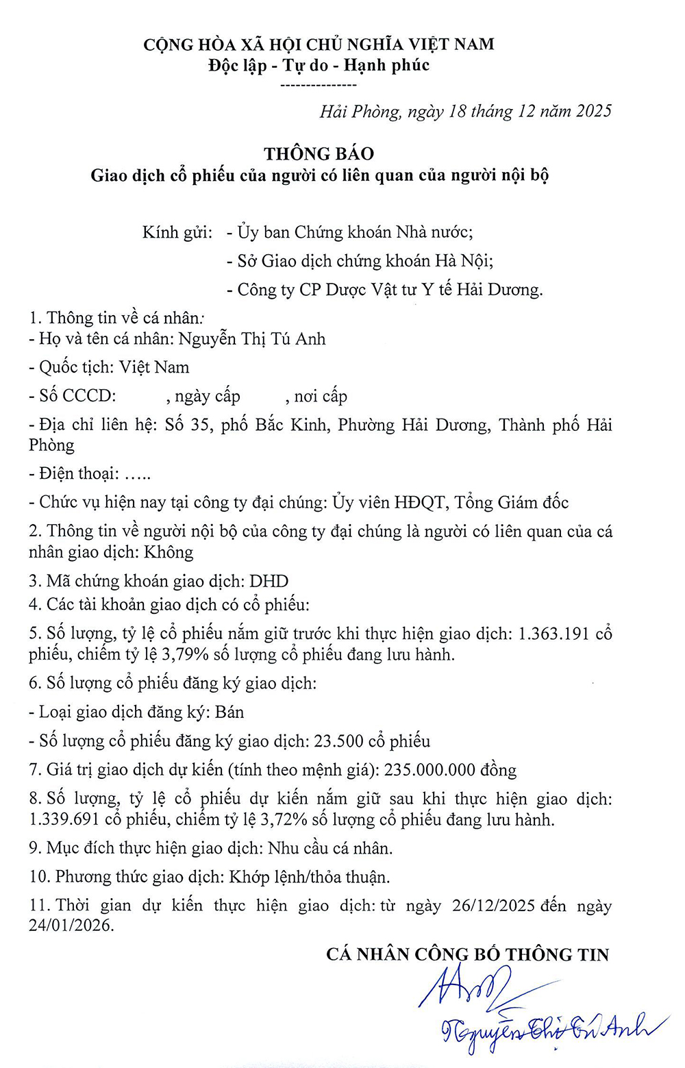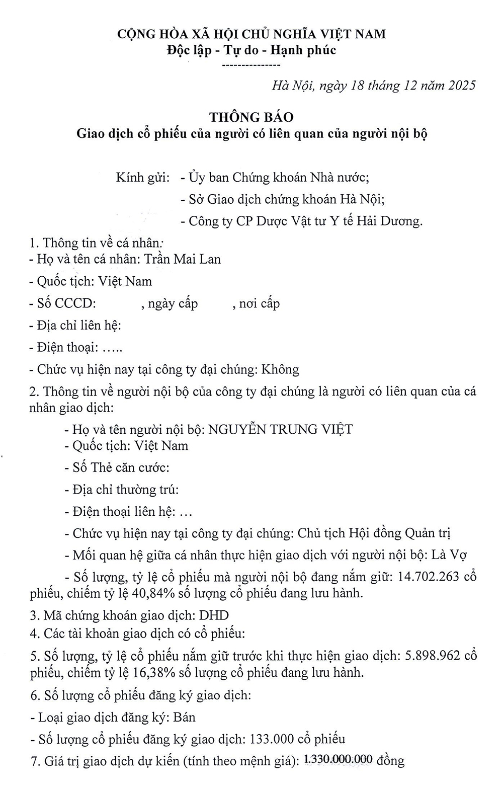 Thông báo giao dịch cổ phiếu của người nội bộ của công ty đại chúng ngày 18 tháng 12 năm 2025.