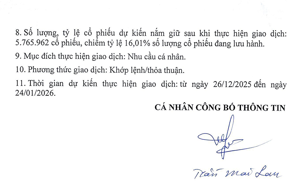 THÔNG BÁO GIAO DỊCH CỔ PHIẾU CỦA NGƯỜI NỘI BỘ THÁNG 12/2025