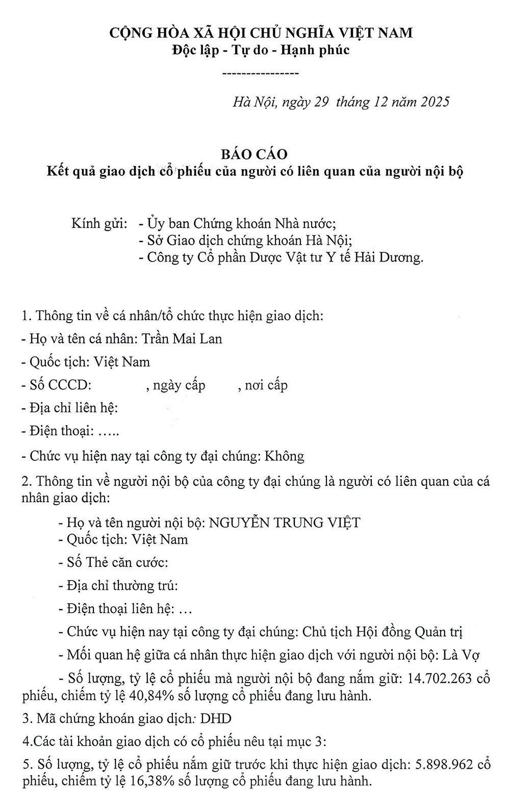 Thông báo kết quả giao dịch cổ phiếu của người nội bộ của công ty đại chúng ngày 29 tháng 12 năm 2025.