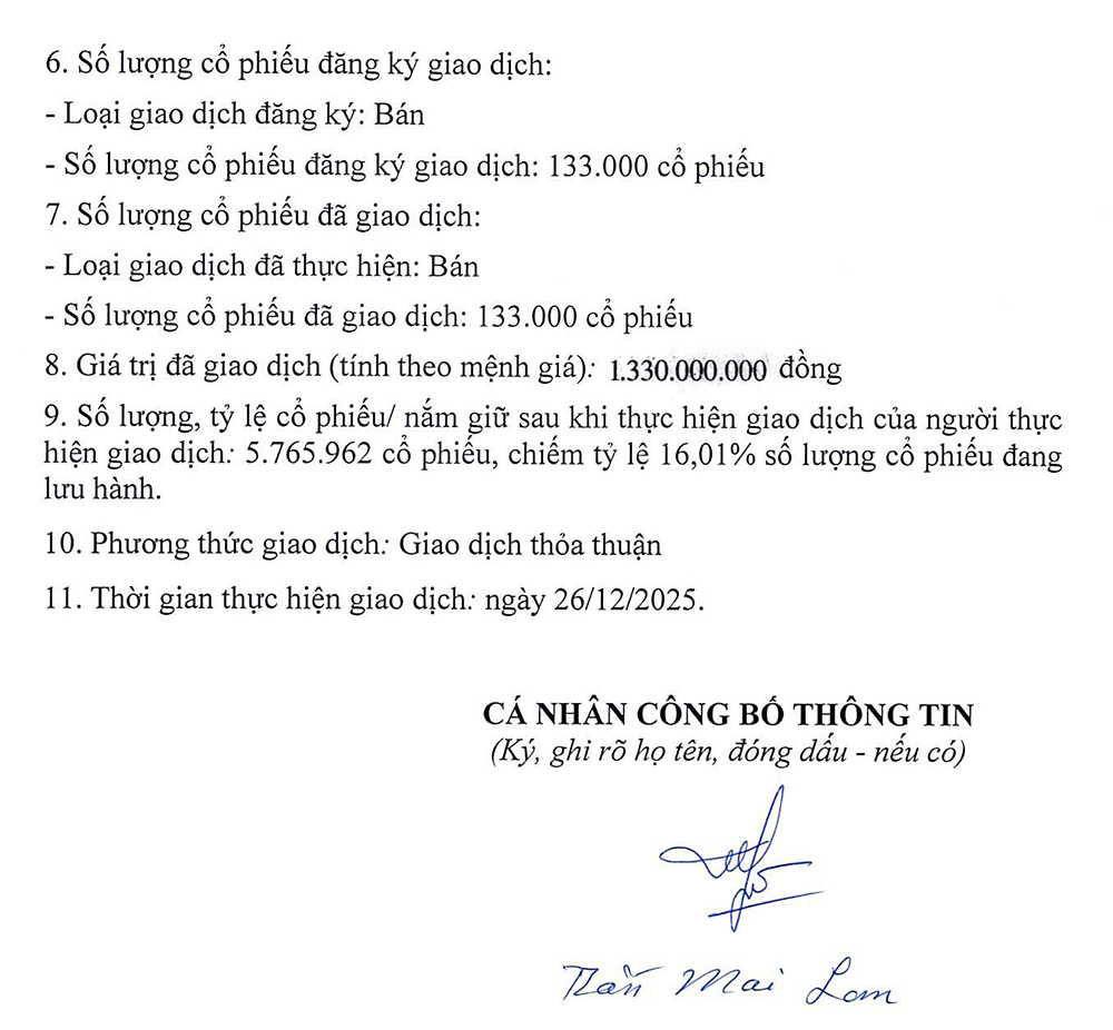THÔNG BÁO KẾT QUẢ GIAO DỊCH CỔ PHIẾU CỦA NGƯỜI NỘI BỘ THÁNG 12/2025