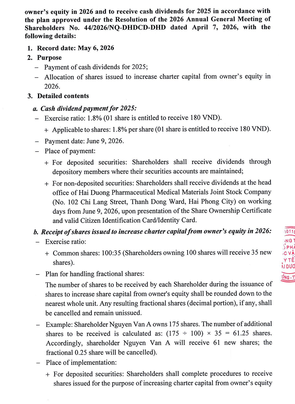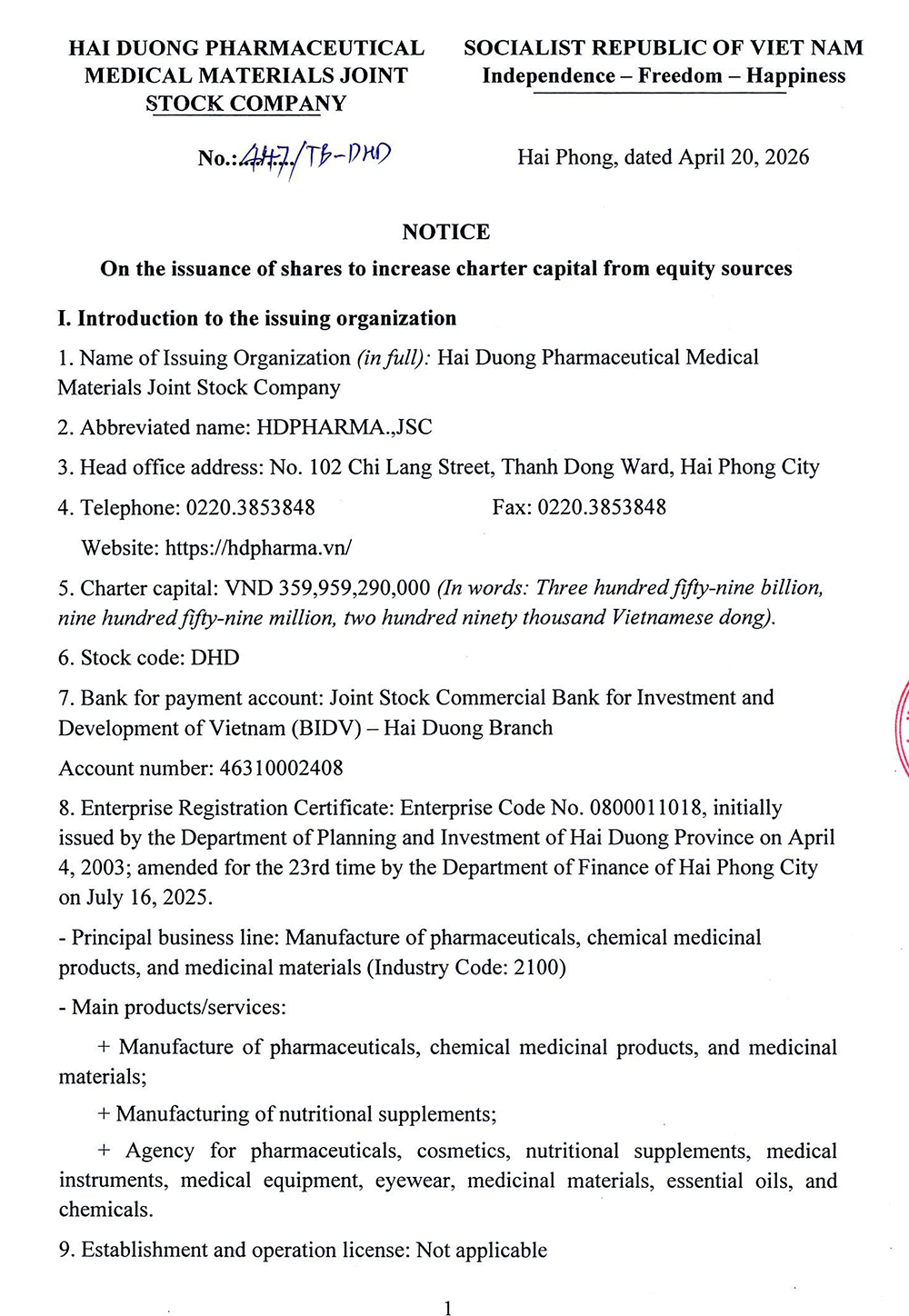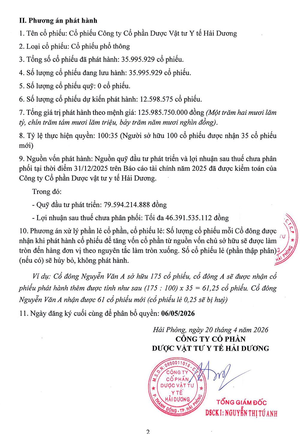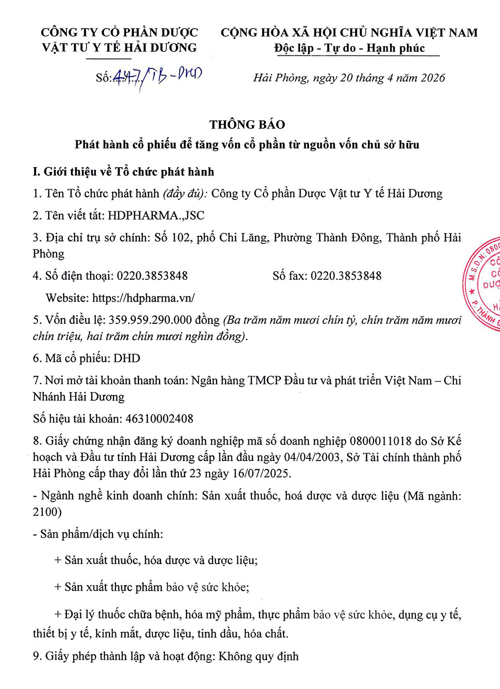 Ngày 20/04/2026, Công ty Cổ phần Dược Vật tư y tế Hải Dương (mã chứng khóa: DHD) thông báo phát hành cổ phiếu để tăng vốn cổ phần từ nguồn vốn chủ sở hữu.